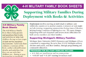 The 4-H Military Family Book Sheets help parents and guardians find books and activities to help their children during various stages of their service members’ deployments.