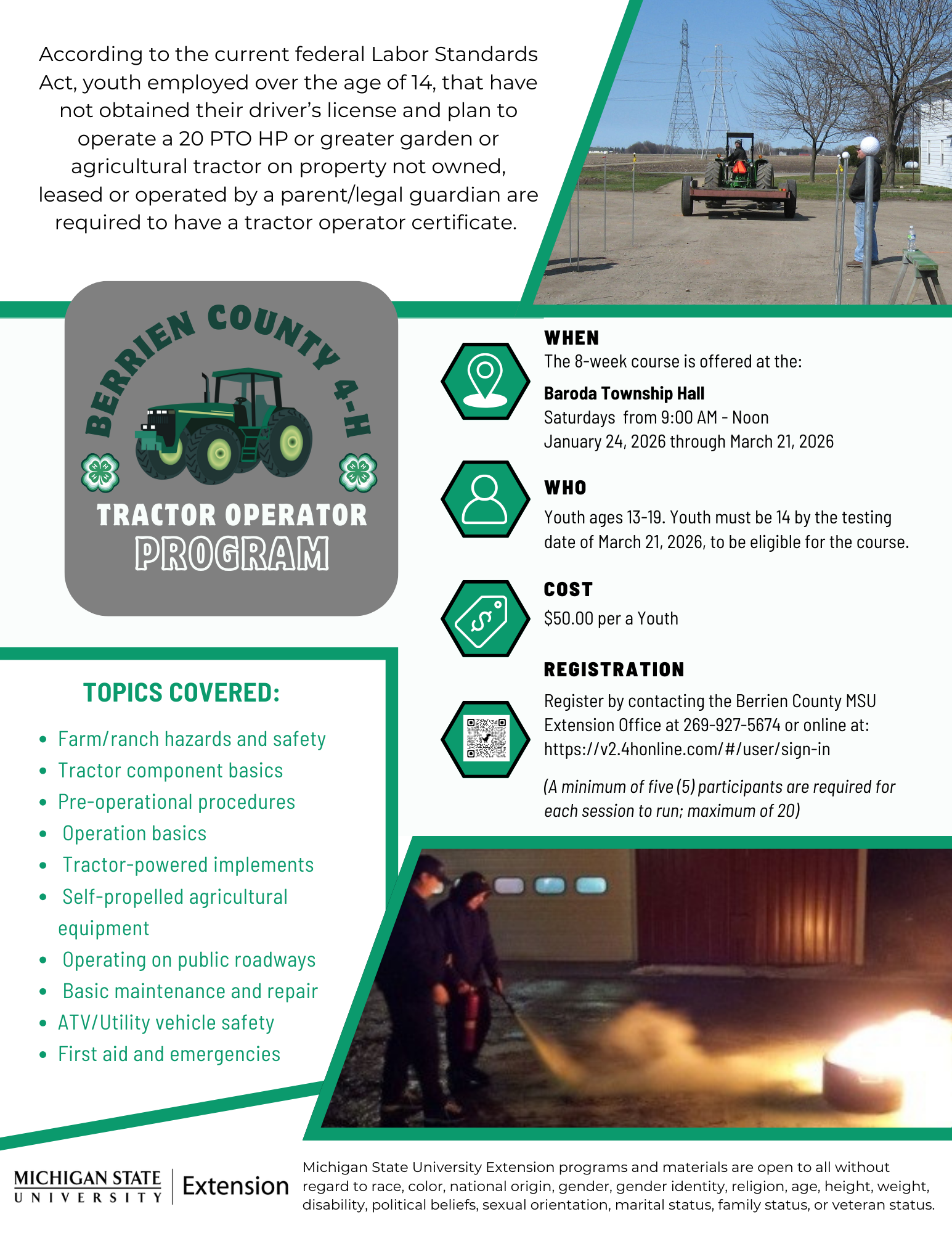 Michigan State University Extension offers the Tractor Operator Program (TOP) through the 4-H Youth Development Program. Successful completion of 4-H TOP provides completion certificates to 14 - 19 year old. 14 - 15 year old youth may be eligible to receive a certificate of training from the U.S. Department of Labor required for operation of a 20 PTO HP or greater, garden or agricultural tractor, by a 14 and 15 year old youth employed on property NOT owned, leased or operated by a parent/legal guardian.