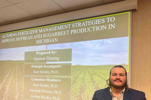 Spencer Fleming recently defended his CSS master’s thesis, “Altering Fertilizer Management Strategies to Improve Soybean and Sugar Beet Production in Michigan,” under the guidance of Dr. Kurt Steinke, Dr. Christina DiFonzo, and Dr. Zachary Hayden. -