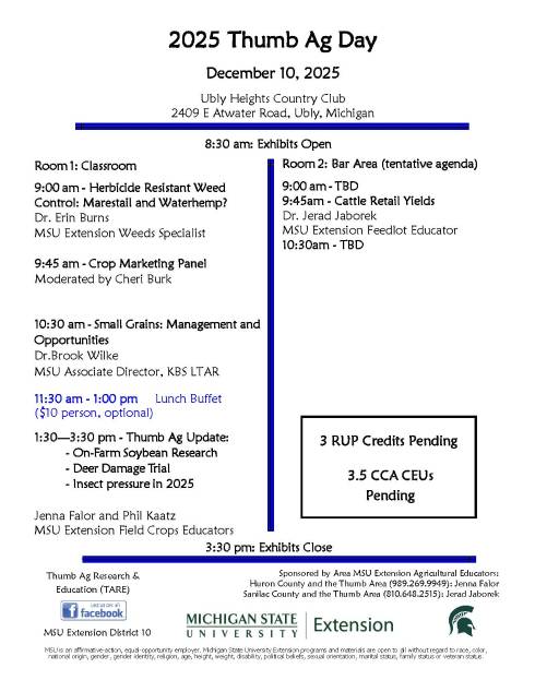 Michigan State University Extension will host Thumb Ag Day on Wednesday, December 10th at Ubly Heights Country Club.