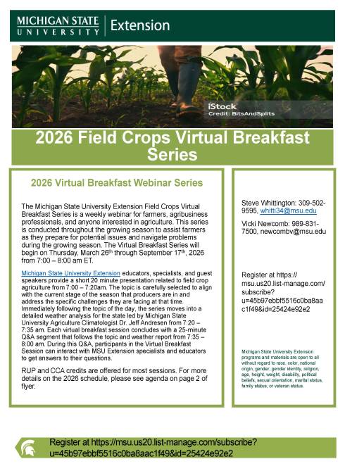 The Michigan State University Extension Field Crops Virtual Breakfast Series is a weekly webinar for farmers, agribusiness professionals, and anyone interested in agriculture. This series is conducted throughout the growing season to assist farmers as they prepare for potential issues and navigate problems during the growing season. The Virtual Breakfast Series will begin on Thursday, March 26ththrough September 17th, 2026from 7:00 –8:00 am ET.