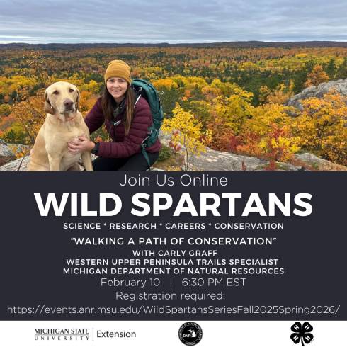 Join 4-H staff as we take a look into life working with fisheries and wildlife! This month’s 4-H Wild Spartans Series will take a walk through the woods on the wild side of conservation. Join us on Tuesday, February 10th, 2026 at 6:30pm EST for “Walking a Path of Conservation.”