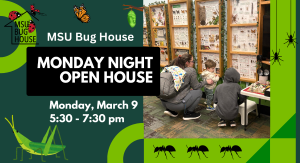 The MSU Bug House will be open to the public on Monday, April 10, from 5:30-7:30 pm. Explore the amazing world of insects as you view displays of insect diversity and learn to handle some of our friendly live insects. This is a free event. Advance registration is required.