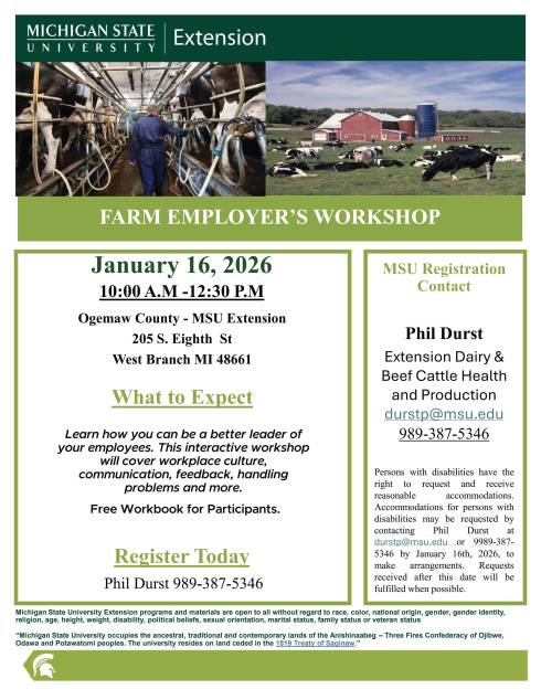 Join MSU Extension Educator Phil Durst for an interactive workshop on farm leadership. From clear communication to effective conflict resolution, you can learn valuable skills to manage your workforce. Participants will receive a free workbook.