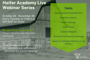 Join MSU Extension Dairy Educator Cora Okkema each Wednesday at 11 a.m. from April 2 to May 7 as she brings in experts from across the dairy industry to talk about heifer management practices and practical applications. Each session will cover a different topic related to heifer management, with a Q&A session at the end for questions. A complete list of dates and speakers are below: