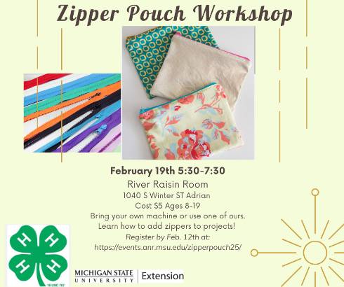 Youth ages 8-19 will learn how to sew a zippered pouch. Bring your own machine for ease of use or use one of ours. Extra fabric and zippers will be available to take home to practice your skills.