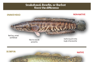 Learn how to ID between bowfin, burbot, and the invasive northern snakehead by spotting key differences in body shape, coloration, and fins. -