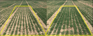 This increase in the number of tillers likely goes back to the aforementioned optimal plant distribution consisting of uniform spacing all the way around each plant. By randomly distributing the seed over the soil surface, we can break away from the row pattern with high density within rows and low density across rows, achieving something that more closely resembles our optimal distribution (Figure 4). This allows plants to make more efficient use of the space available to them, resulting in increased tillering.
