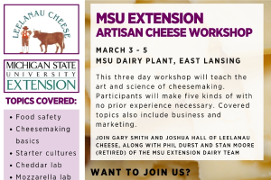 Gary Smith and Josh Hall, owners and operators of Leelanau Cheese will lead participants through the steps of making various cheeses and explaining differences in process that result in different cheeses. MSU Extension Educators, Stan Moore and Phil Durst, will teach the business of cheese.