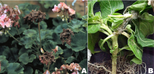 This spring’s overcast and cool weather has favored the fungus Botrytis cinerea, which causes a gray mold on many greenhouse ornamentals. Recognizing the problem isn’t difficult. Common disease symptoms include leaf spots and blight and stem cankers (Figure 1). Botrytis’ calling card includes the large masses of gray conidia or spores that are produced. It is this gray conidial fuzz that gives this disease the name “gray mold.” An infection that started as a small leaf spot that’s barely noticeable can quickly expand into a large area. Flower petals that drop on the leaves serve as a food base for Botrytis, allowing the pathogen to easily infect leaves. Water and high relative humidity are the key drivers for Botrytis.