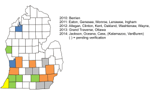 It’s that time of year again when brown marmorated stink bugs invade structures humans create looking for a place to hunker down for winter. Since last fall when Michigan residents were asked to report brown marmorated stink bugs in their homes, we now know that brown marmorated stink bugs are well-established as a nuisance pest in homes in the southern Lower Peninsula of Michigan.