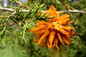 In the spring, following a warm rain in late April into May, cedar-apple rust galls explode into a colorful display. Calls to the Michigan State University Extension garden hotline start coming in as people are amazed and sometimes dismayed at the orange, slimy, starfish-like things hanging in their trees. They either believe the trees are blooming or an alien has left them an unwanted gift.