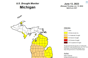 Current GDD accumulation vary across the state from about 360 GDD50 in southern Michigan (weather station location, 10-14 days ahead of normal) to 200 GDD50 in northern Michigan (weather station location, three days ahead of normal) (Photo 5). The Upper Peninsula has approximately 110 GDD50, which is near normal. Predictions for the next several weeks include above average temperatures. It has been an active period of precipitation for the Lower Peninsula, with several rounds of thunderstorms and some severe weather including tornadoes in the Kalamazoo, Cass and St. Joseph counties. Small portions of the Upper Peninsula remain in abnormally dry to severe drought conditions (Photo 6).