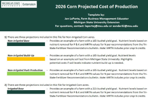 The 2026 Projected Cost of Production tools for Corn can be found in the cost of production section on the MSU Extension Farm Management website.