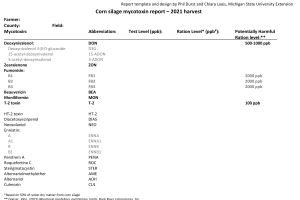 Results from 2019 indicated that mycotoxins are widespread in corn silage across Michigan. However, more samples over multiple years are needed to reach any conclusions. While some farmers may feed a “binder” to tie up the toxin in the animal’s digestive tract, this is not always effective and is only a treatment after the animal has already ingested toxins. Since there are few ways to overcome problems once mycotoxins are present in corn, prevention of mycotoxin accumulation in the field is essential. Mycotoxin content in a bunker silo will not decrease or be eliminated with corn silage fermentation. Management practices that can be used to minimize mycotoxin production in a corn field include hybrid selection with insect protection traits, fungicide application, scouting and spraying for ear feeding insects, crop rotation, tillage and early harvesting.