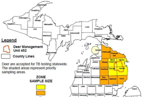 This year, the Michigan Department of Agriculture and Rural Development (MDARD) signed a new Memorandum of Agreement (MOA) with the United States Department of Agriculture (USDA). In this new MOA, finding one or more positive cattle herds with bacteria from the Modified Accredited Zone deer strain in Michigan’s TB-free counties mandates that discussions with USDA be initiated to discuss different response activities including changing TB zoning and/or increasing cattle and deer surveillance.