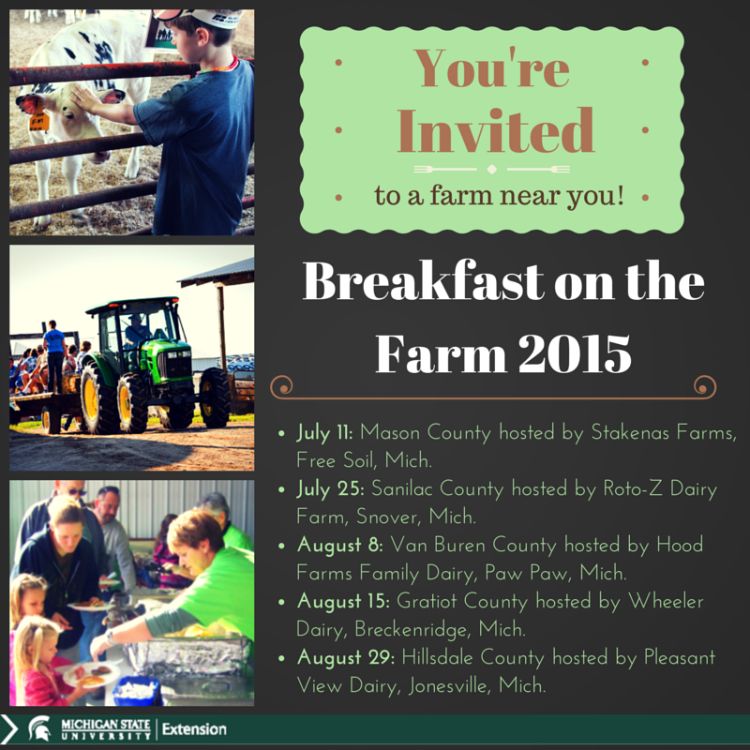 Come one; come all to a Breakfast on the Farm event near you. Starting July 11th, there will be five opportunities for you to visit a modern Michigan dairy farm.