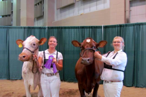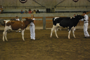 About 600 miles north of where Jersey cattle originated is the County of Ayr, Scotland, United Kingdom, the location where the Ayrshire dairy breed was started. In the early years, this breed of cattle was first known as Cunninghams, then Dunlops, and finally the Ayrshire name was adopted. It took several years for the cattle’s characteristics to be well-defined enough to be considered a different breed, but that happened with the first Ayrshire show, sponsored by the Highland Agricultural Society, in 1786. The precise cattle breeds used to generate Ayrshires is not known, but it is hypothesized that strains of other European or Channel Islands breeds were mated with cattle native to this geographic region to create Ayrshire dairy cattle. Early Ayrshires flourished in the Scottish landscape because they were very efficient grazers, were well-adapted to the climate and terrain because of the cross with native cattle species, and were known for the quality of their udder.
