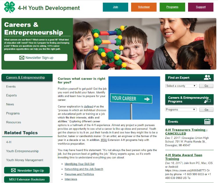 Michigan State University Extension provides research and education in the areas of careers, workforce preparation and entrepreneurship offering workshops, trainings and sharing of information. What types of information are on the website and how do I find out where it is at? Just visit the MSU Extension website, click on 4-H in the navigation and scroll down to Careers and Entrepreneurship section. If by chance you are unable to find this website, check with your local MSU Extension staff. They will share with you how to find the information and show what is listed. Workshops, trainings and resource people can also be shared to give volunteers and teen leaders more information on specific topics.