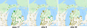 Late blight is caused by Phytophthora infestans, which favors 60-80 degree Fahrenheit temperatures, high humidity and frequent rainfall. The Michigan late blight forecast tool calculates disease severity values (DSVs) based on the duration of temperature and relative humidity conditions that are favorable for disease development. Accumulated DSVs (based on early May emergence) are used to determine the local late blight risk level, indicated by the color of the map marker pins: