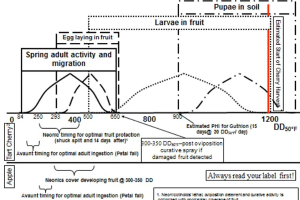 Field scouts should use traps and the degree day model provided on MSU’s Enviroweather system to set a biofix. After adult emergence, scouts should begin monitoring for summer generation larvae by examining 10 fruit clusters and 10 terminals on five trees per orchard each week. Using this method, an insecticide application is warranted if three larvae per tree are found.
