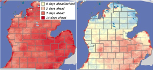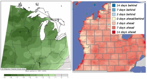 As predicted, temperatures this past week were reminiscent of mid-August rather than early June. We were 7 to 10 degrees warmer than normal in southwest and south central Michigan. The upper atmosphere trough feature and a tropical air mass from the Gulf of Mexico—along with high dew points and particularly unpleasant humidity levels—will be moving out of the Upper Midwest over the next couple of days and temperatures will be moderating to normal and possibly even below-normal levels starting next week.