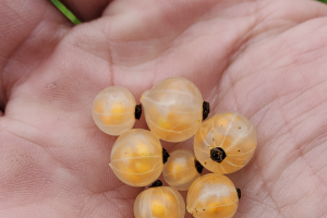 Raspberry harvest continues with the harvest of both red and black raspberries. Blackberry harvest has begun. Spotted wing Drosophila larvae are being found in unsprayed backyard fruit. Spotted wing Drosophila catches in monitoring traps are beginning to increase.