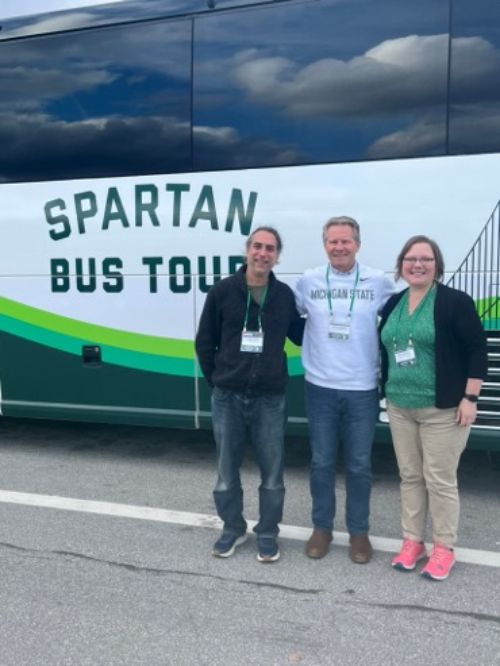 On the Road with the Spartan Bus Tour: Gregory Bonito, President Kevin Guskiewicz and Plant Soil Microbial Sciences Chair Sydney Everhart (from left to right).