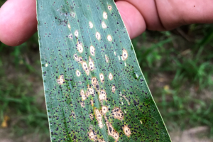 Tar spot is caused by the fungus Phyllachora maydis and can be identified by the raised, black spots that appear on corn leaves and husks. Surrounding some of the black spots may also be a tan halo, which is called a fish-eye lesion.