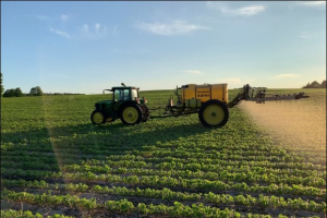 DeerPro and untreated control treatments were randomly assigned and replicated four times for a total of eight plots arranged in a randomized complete block design. DeerPro Spring and Summer was applied at a rate of 1.25 gallons per acre carried in 8.75 gallons of water (10 gallons per acre total rate) using the grower’s self-propelled sprayer on June 7 at the unifoliate leaf stage (VC) (Figure 3). DeerPro Ag was applied at a rate of 1.45 gallons per acre carried in 8.55 gallons of water (10 gallons per acre total rate) using the grower’s self-propelled sprayer on June 29t at the four-leaf stage (V4). Both repellent applications were made within two days of, but separate from, Liberty herbicide applications for weed control. Trail cameras with motion activated triggers were placed at the edge of each plot on June 20 to monitor how many deer were present and actively feeding.