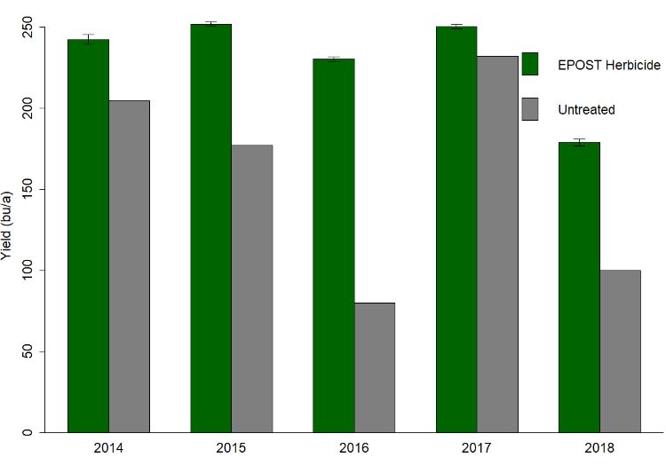With this topic at hand, I “mined” the last five years of the MSU Weed Science Program’s data for studies evaluating one-pass postemergence (EPOST) strategies for weed control in corn. Post-herbicide applications were made on V3-V4 corn (ranging from 6-12 inches tall) and weeds were 4 inches tall or less. One-pass postemergence herbicide programs yielded on average 38, 75, 150, 19 and 79 bushels per acre greater than untreated control plots in 2014-2018 (see the graph). For specific herbicide treatments used in these studies, visit the Annual Results tab of the MSU Weed Science website.