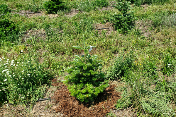 Organic mulching for weed control and mitigating cold stress in Christmas tree production
