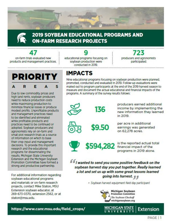 MSU Extension and the Michigan Soybean Promotion Committee cooperated to plan, conduct and summarize 47 on-farm trials in 2019. Ten projects, based on input from more than 340 producers and agronomists, were evaluated in the trials. The research results were summarized in a 32-page research report and mailed directly to more than 11,000 soybean producers. We also planned, promoted, conducted and evaluated six educational meetings around the state reaching 342 producers and agronomists. The goals of the meetings were to 1) present the previous year’s research results and answer questions, 2) gather input regarding future research projects and 3) recruit new trial cooperators. A follow-up evaluation mailed to program participants measured and documented the actual financial and educational impact of the programs. Forty-seven of the respondents earned additional money by implementing the new information. The average amount of additional income was $11.80 per acre applied to 14,170 acres, producing an actual financial impact of $167,320 in 2019 alone.