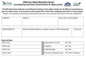 The MSU Agronomy Program is providing free testing of corn silage samples for 26 different mycotoxins as part of a state survey. To receive test results, please fill out this form completely and attach to each sample.