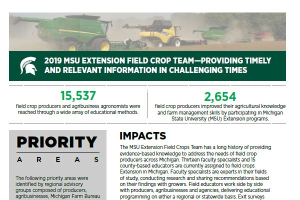 More than 240 producers and agronomists participated in the programs. MSU Extension developed a follow-up evaluation to measure and document the actual educational and financial impacts of the program and mailed it to 243 meeting participants. Fifty-six producers said they earned additional money in 2022 by implementing the new information they learned at the program. The average amount of additional income was $16.95 per acre applied to 19,558 acres, producing an actual financial impact of $336,215 in 2022 alone.