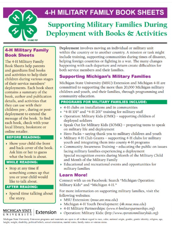 The 4-H Military Family Book Sheets help parents and guardians find books and activities to help their children during various stages of their service members’ deployments. Each book sheet contains a summary of the book, author and publication details, and activities that they can use with their children pre-, during or post-deployment to extend the message of the book. To find each book, check with your local library, bookstore or online retailer.