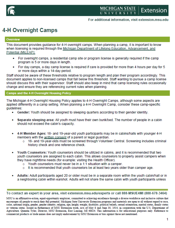 The Michigan 4-H Overnight Housing Policy applies to 4-H Overnight Camps, although some aspects are applied differently in a camp setting. When planning a 4-H Overnight Camp, consider these camp-specific guidelines: