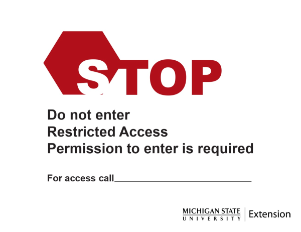 Printable biosecurity stop sign to restrict access to a farm or area on a farm with a section to include a contact name and phone number for the farm.