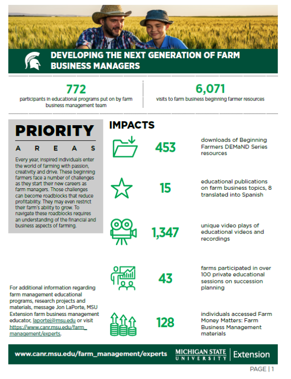 For additional information regarding farm management educational programs, research projects and materials, message Jon LaPorte, MSU Extension farm business management educator, laportej@msu.edu or visit https://www.canr.msu.edu/farm_ management/experts.