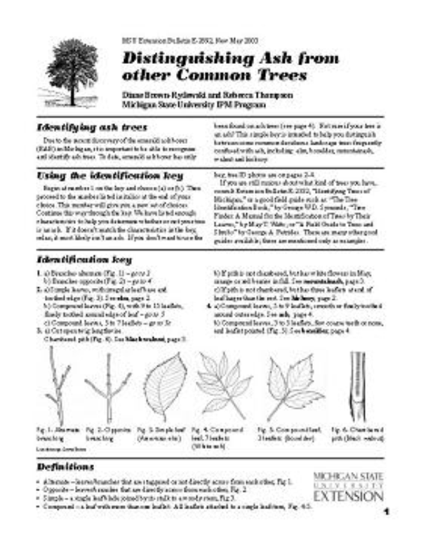 Due to the recent discovery of the emerald ash borer (EAB) in Michigan, it is important to be able to recognize and identify ash trees. To date, emerald ash borer has only been found on ash trees (see page 4). Not sure if your tree is an ash? This simple key is intended to help you distinguish between some common deciduous landscape trees frequently confused with ash, including: elm, boxelder, mountainash, walnut and hickory.
