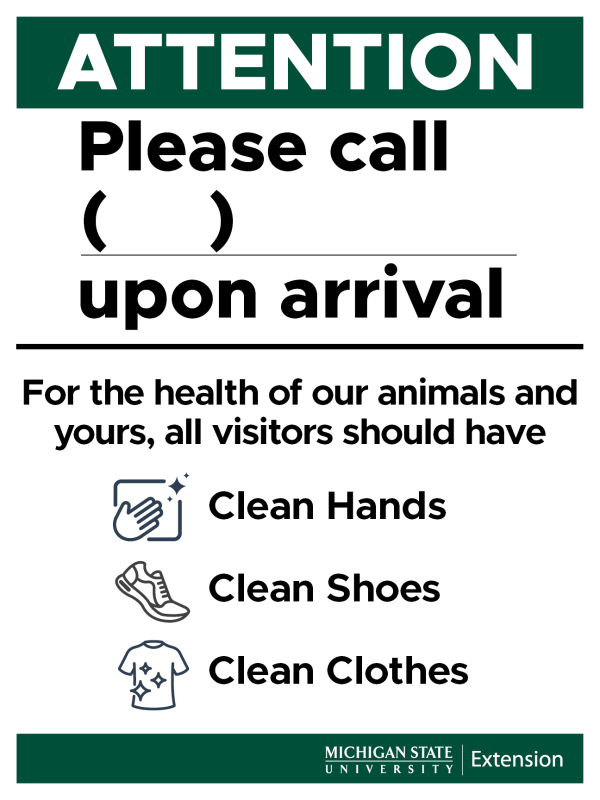 Printable biosecurity sign to alert visitors to call owners when they arrive, encouraging visitors to wear clean clothing and shoes, and to clean their hands.