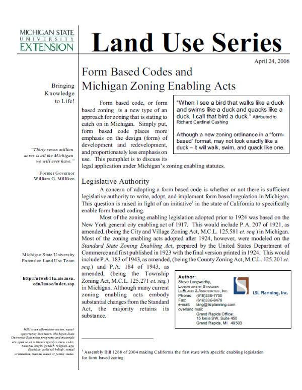 With neo-traditional development, and development attempting to follow traditional patterns, a new type of zoning is starting to catch on in Michigan: Form-Based Code, or Form-Based Zoning. This type of zoning places more emphasis on the design (form) of development and redevelopment and less on the type of use. This pamphlet is to discuss its legal application under Michigan's zoning enabling statutes. Please make sure your copy is dated March 1, 2018 or newer.