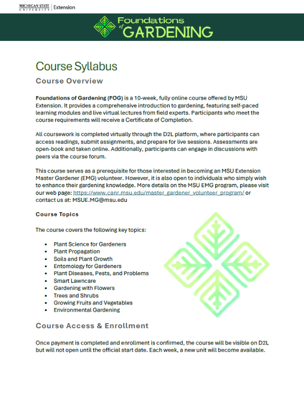Foundations of Gardening (FOG) is a 10-week, fully online course offered by MSU Extension. It provides a comprehensive introduction to gardening, featuring self-paced learning modules and live virtual lectures from field experts. Participants who meet the course requirements will receive a Certificate of Completion.