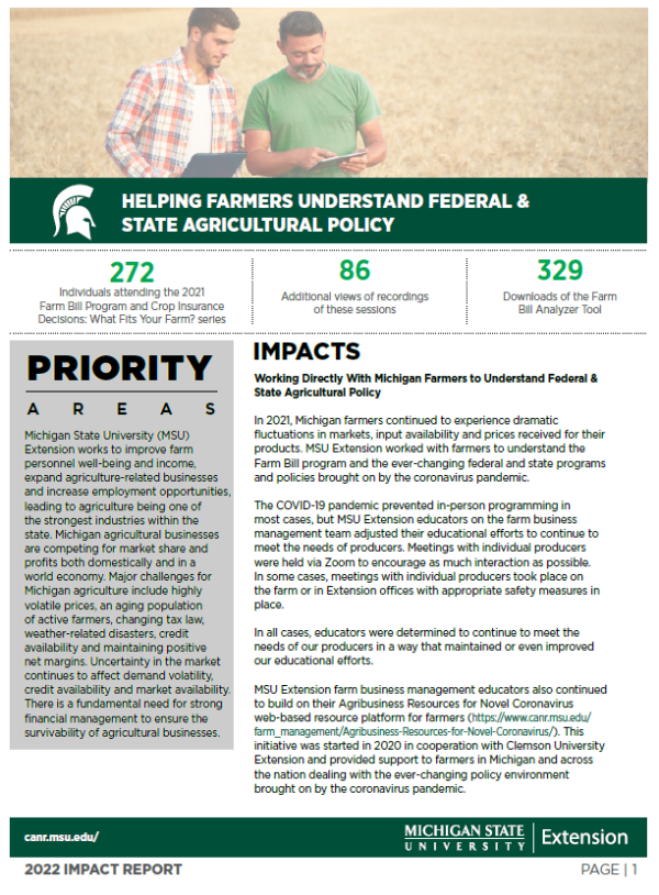 MSU Extension farm business management educators also continued to build on their Agribusiness Resources for Novel Coronavirus web-based resource platform for farmers (https://www.canr.msu.edu/ farm_management/Agribusiness-Resources-for-Novel-Coronavirus/). This initiative was started in 2020 in cooperation with Clemson University Extension and provided support to farmers in Michigan and across the nation dealing with the ever-changing policy environment brought on by the coronavirus pandemic.