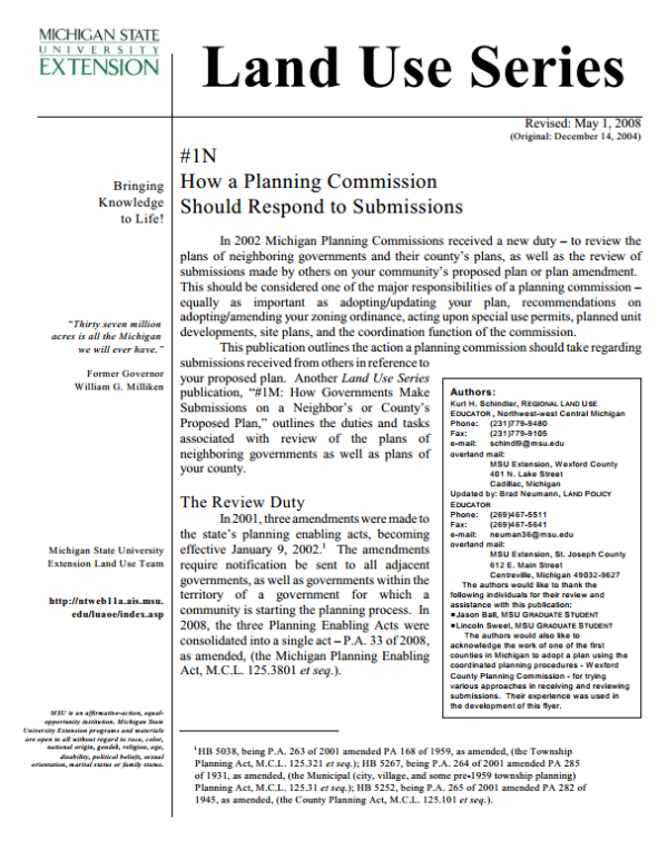 In 2002, Michigan Planning Commissions had another series of steps added to the process of adopting a plan. One of those steps is to solicit comments from neighboring governments on one's own proposed plan. After those submissions are received each should be assessed and action taken. This publication reviews the duty of looking at each submission received and responding to those submissions, how long one waits for submissions, what to do with the comments on one's plan, examples of submissions and responses as well as other tips.