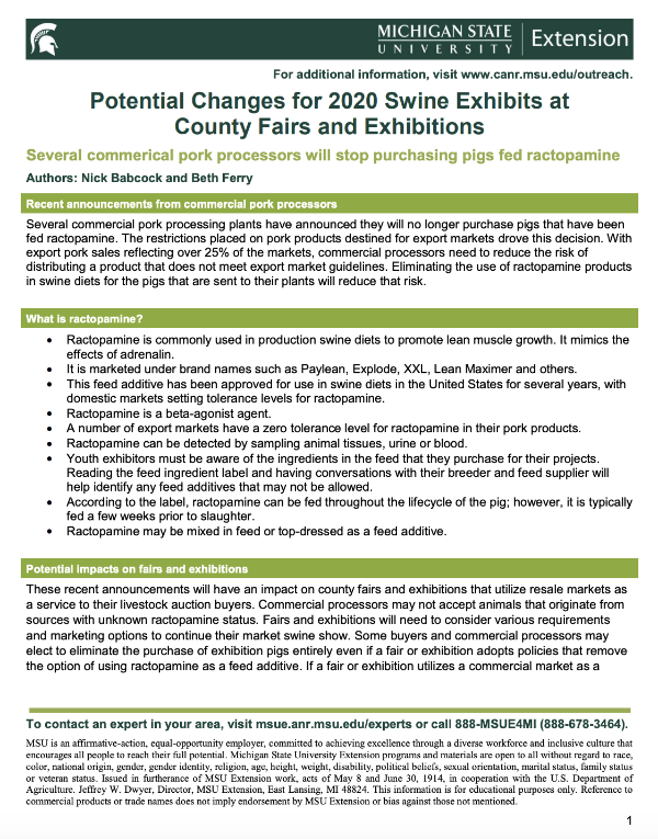 These recent announcements will have an impact on county fairs and exhibitions that utilize resale markets as a service to their livestock auction buyers. Commercial processors may not accept animals that originate from sources with unknown ractopamine status. Fairs and exhibitions will need to consider various requirements and marketing options to continue their market swine show. Some buyers and commercial processors may elect to eliminate the purchase of exhibition pigs entirely even if a fair or exhibition adopts policies that remove the option of using ractopamine as a feed additive. If a fair or exhibition utilizes a commercial market as a destination for their pigs, it is important that they have a conversation regarding requirements and availability with the market that they work with.