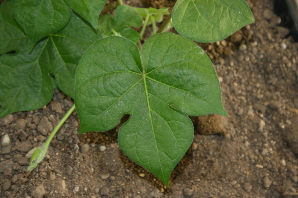 Cotyledons are butterfly-shaped and usually narrower at the base. Leaves are alternate with erect hairs on both surfaces. The first leaf may be unlobed; all other leaves are three-lobed and ivy-shaped.