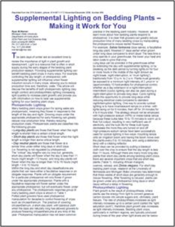 This article discusses the benefits of both photoperiodic lighting (day length control) and photosynthetic lighting (increasing light quantity to increase plant growth) on bedding plant crops.