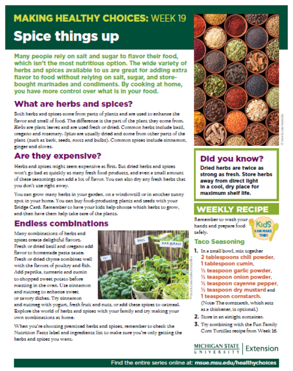 Many people rely on salt and sugar to flavor their food, which isn’t the most nutritious option. The wide variety of herbs and spices available to us are great for adding extra flavor to food without relying on salt, sugar, and store-bought marinades and condiments. By cooking at home, you have more control over what is in your food.