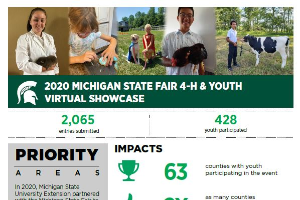 It is the mission of The Michigan State Fair and Michigan 4-H to promote and celebrate the positive achievements by youth in the state of Michigan. In order to provide youth participants in the Michigan State Fair 4-H & Youth Virtual Showcase with recognition and reward, up to ten $1,000 scholarships will be awarded through an application process as outlined below. These scholarships are possible due to a generous donation from Blair Bowman of the Michigan State Fair.